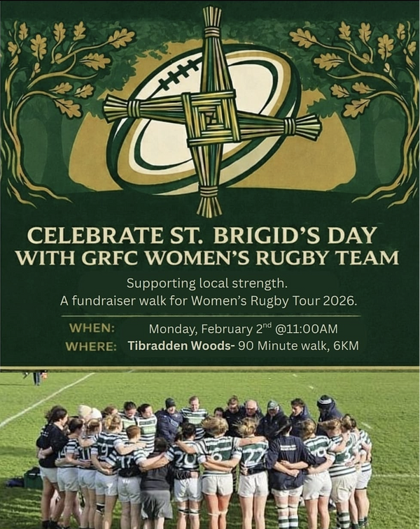 To celebrate St. Brigid’s Day and support our "Local Strength," the GRFC Women’s Rugby Team is inviting you, your families, and your four-legged friends to a fundraiser walk in Tibradden Woods on Monday, February 2nd.